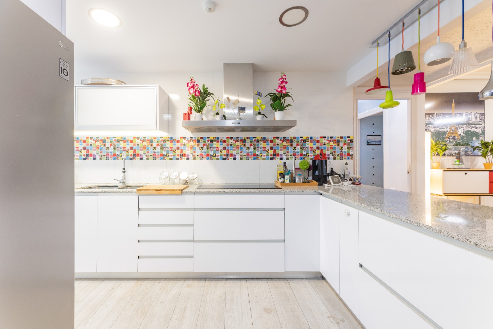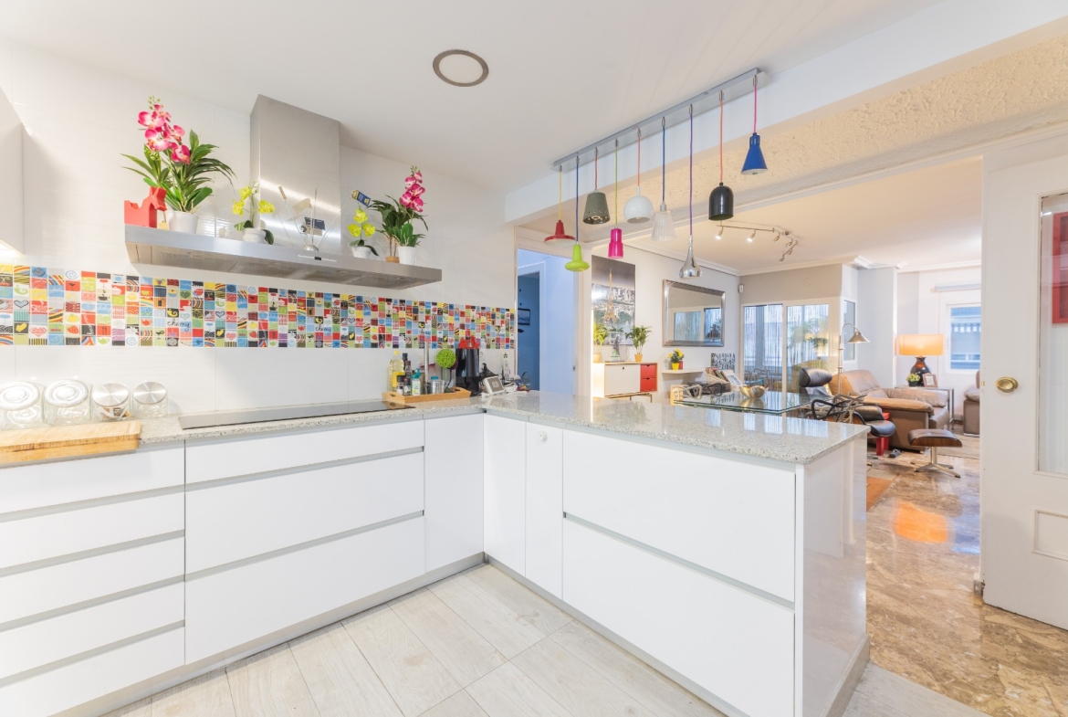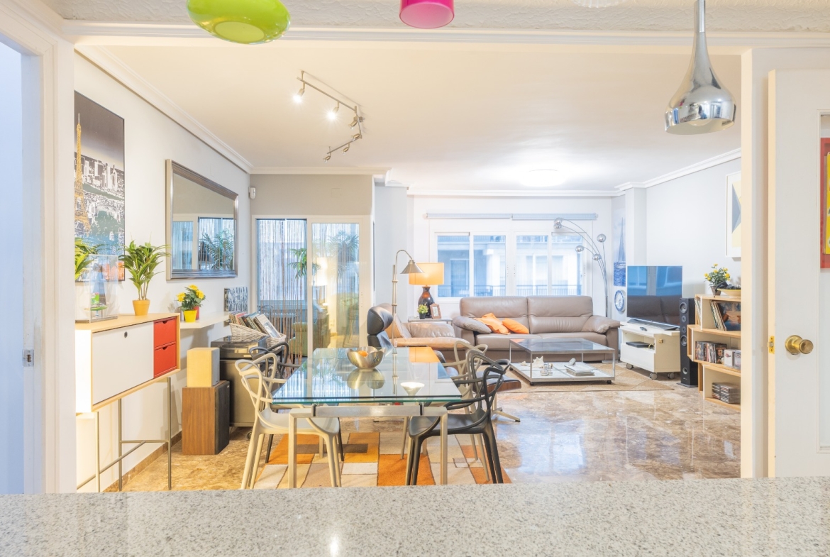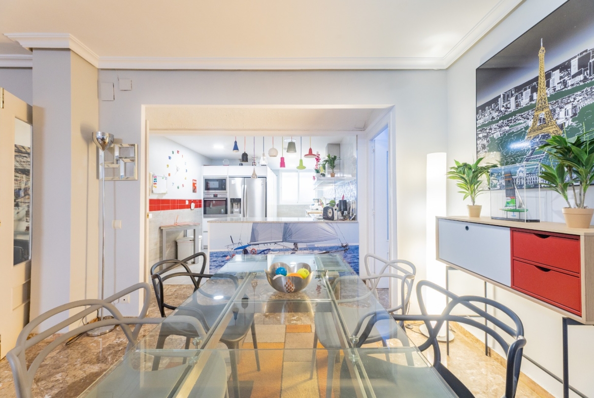 El salón-comedor es generoso y recibe luz natural a través de grandes ventanales. La cocina integrada, totalmente equipada, se abre al espacio principal y aporta una forma de vivir cómoda y práctica, tanto en el día a día como cuando se recibe en casa.